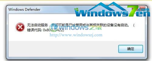 小编前几天新装了win7旗舰版 ,并把windows7 安全中心windows defender关闭。昨天,测试几个病毒库数据包时打开windows defender,但系统提示“无法启动服务,原因可能是已经禁用或与其他管理的设备没有启动(错误代码:0x80070422)”如图一。请教其他几位同事后终于得以把此问题解决,小编今天在Win7教程 下与大家分享下如何启动windows defender吧!