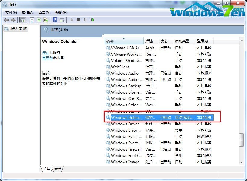 第二步:确定后在弹出的对话框中找到windows defender这个选项并双击打开。如图三