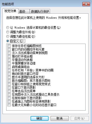 3:打开“系统性能”对话框后,如图(1)所示,在“视觉效果”选项卡下的“自定义”列表框中取消选择不需要的特效,单击“确定”按钮。使用的视觉效果越少,系统的运行速度越快。