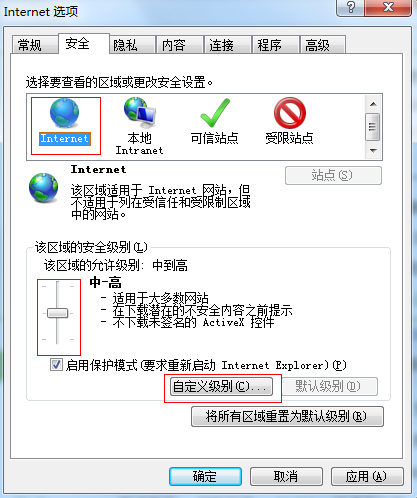2:在“Internet选项”对话框中打开“安全”选项卡,然后选择“Internet”图标,接着拖动滑块调整访问Internet时的安全级别,在滑块右侧会显示当前安全模式的简要说明。如果要进行更详细的设置,可单击“自定义级别”按钮。如图1-1所示: