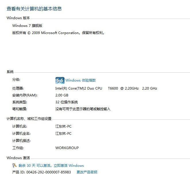 1.首先,我们查看华硕win7旗舰版的激活状态。在桌面上找到“计算机”,右键属性,在弹出页面的最下方我们可以看到华硕win7旗舰版的激活状态,这里显示“剩余30天可以激活”。如图一