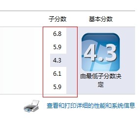 运行评估后稍等一会,Win7就会给出电脑中的每个硬件的评估得分,分数范围从1.0到7.9,整体得分以分数最低的一项决定。