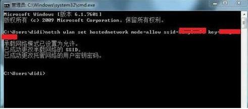接下来我们在弹出来的命令窗口中输入netsh wlan set hostednetwork mode=allow netsh wlan set hostednetwork ssid=yang key=mypc1234。这里需要为大家解释一下,ssid是wifi的名称,而key则是密码,密码是可以任意更改的,但是必须是8位数以上。