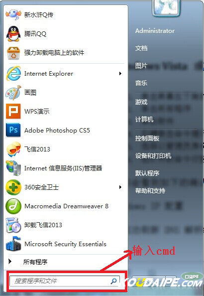 1.点击“开始”,在“搜索程序和文件”搜索栏中输入“cmd”,并按下回车键,如图1所示:
