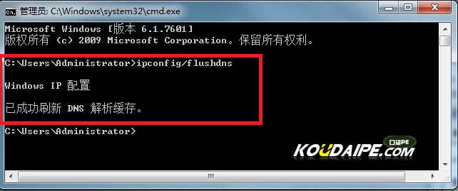 2.在cmd.exe程序框中输入以下命令符:ipconfig/flushdns,就会出现如图2所示: