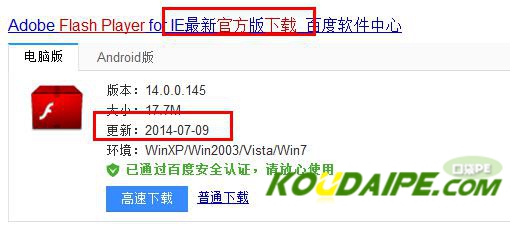 第一步:下载安装flash player for IE的最新版本,如图1,点击“高速下载”,安装过程会自动完成:如图1所示