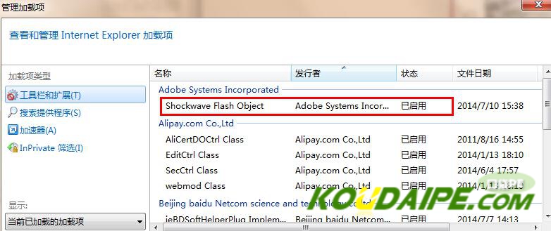 第三步:在“管理加载项”里启用“Shockwave Flash Object”,如图3: