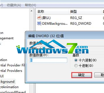 3、然后在右侧找到“OEMBackground”,右键选择第一项“修改”,将其数值改成1。