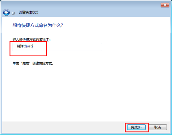 3.在名字一栏输入“一键弹出usb”点击“完成”按钮