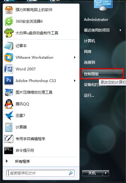 1.打开“开始菜单”点击打开“控制版面”如下图所示