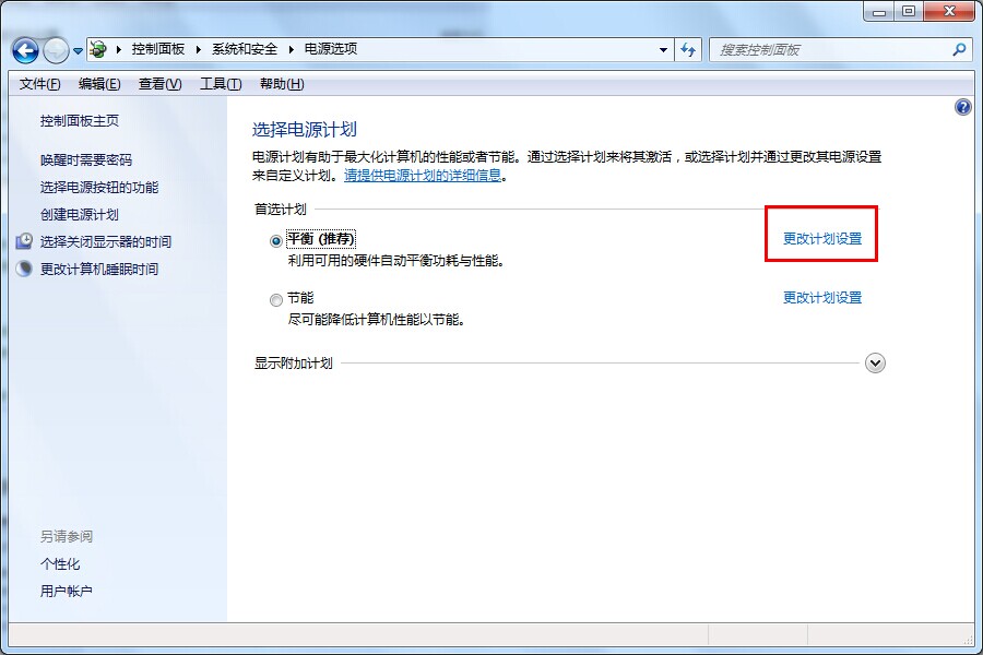 3.来到选择电源计划页面下,选择“平衡(推荐)”后的“更改计划设置”如下图所示
