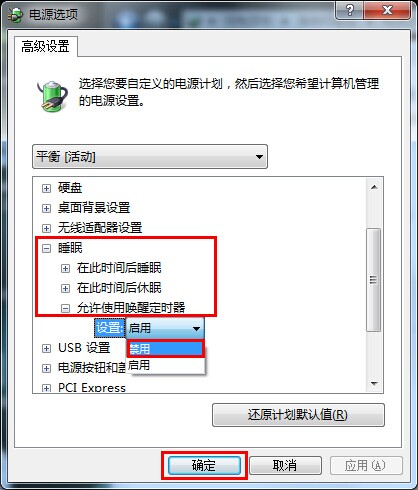 5.在打开的电源选项界面下选择睡眠 - 允许使用唤醒定时器 - 设置(禁用),点击确定保存设置。如下图所示