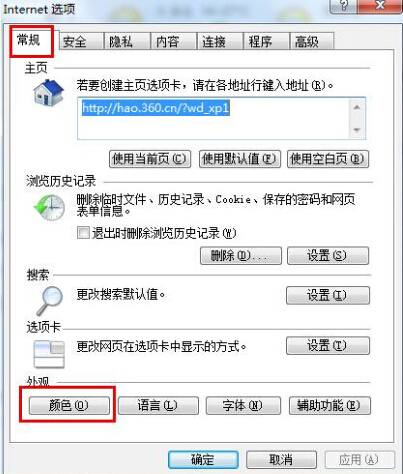 2.在打开的“Internet选项(O)”中,切换到“常规”项,点击“颜色(O)”进入下一步操作。如下图所示