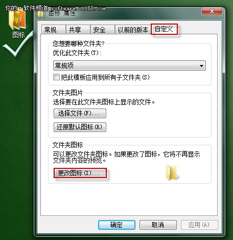 找到想要更改图标样式的快捷方式或者文件夹,右击,在弹出的选项栏中找到属性,选定后会弹出属性设置窗口,找到“自定义”选项卡,我们会看到最后一项为“更改图标”操作,单击进入。