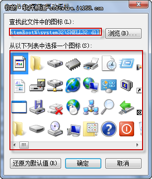 在“为文件夹图标更改图标”的对话框中我们会看到正在使用的图标文件路径,以及Win7为用户默认可选的文件图标样式。