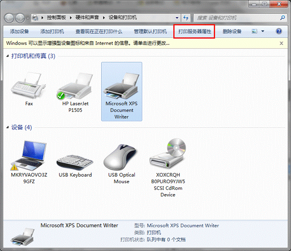 1、首先在控制面板中找到“设备和打印机”选项,然后随便选择一个打印机图标,选择打印机服务器属性。