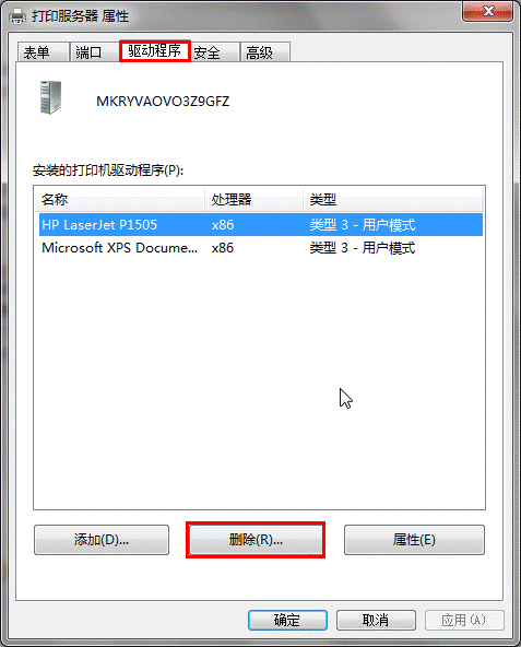 2、接着单击打印服务器属性选择驱动程序点击删除,然后选择删除驱动程序和驱动程序包点击确定。