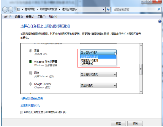 在“通知区域图标”框中找到“音量”选项,将下拉选项改为“显示图标和通知”,最后点击确定