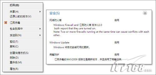 在这项测试中,卡巴斯基8.0同样表现出了较好的系统匹配度。除了提供方便的右键快捷菜单外,同样也与Windows 7 Action Center配合良好。能够准确及时地将病毒库过期、杀软意外关闭等重要信息,传递过去。同时,软件同样允许Action Center直接接管杀软操作。最终判定,通过!