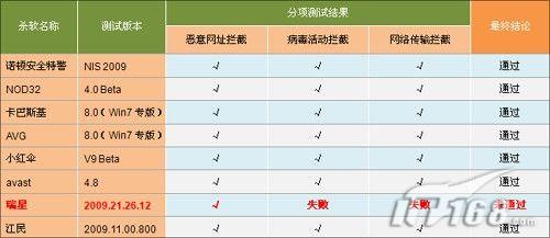 作为国内三大杀软之一的金山毒霸,在刚开始的测试中,也算表现正常。但当文件复制结束,执行配置向导中启动“毒霸防毒系统”这一模块时,却出现了一次错误中断。重启之后,发现杀毒软件无法顺利开启病毒查杀。同时,附带的“金山网镖”也无法工作。而另一款附带软件“金山清理专家2009”,也在随后的系统打分测试中失败,不具备基本的防护性能。最终判定,不通过!