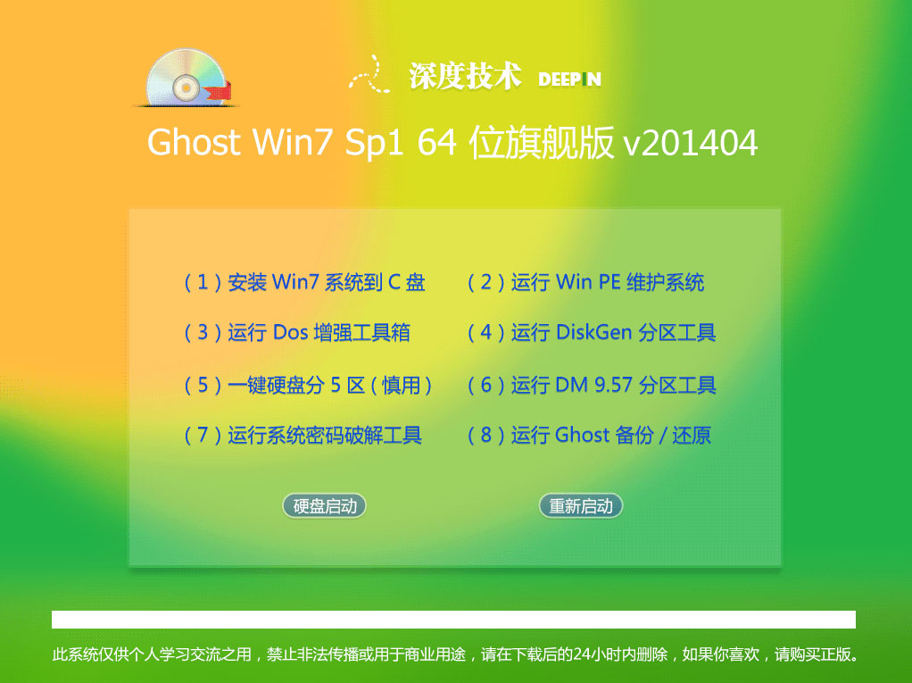 本光盘含深度系统官网Ghost win7克隆版64位(带驱动软件)、WINPE及DOS等工具,支持各大品牌兼容式台式机、笔记本组装机,自动实现win7自动完美激活! 正版验证!安装快捷方便、兼容性高,系统运行稳定、快速、安全!