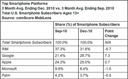 市场调研公司comScore今天公布的数据显示,Google 的Android系统四季度市场占有率从三季度的21.4%增加到28.7%,全面超越iPhone,但依然不敌瘦死的骆驼RIM的31.6%,但按目前的增长率,Google即有望在下个季度超越RIM拿下第一宝座,而微软的Windows Phone 7系统反而出现了下滑,以下是统计图表: