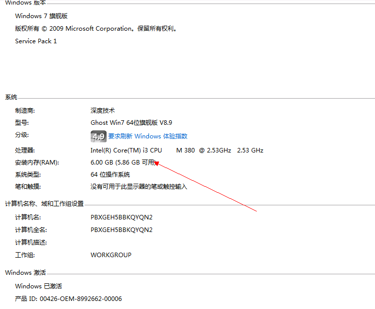 从图1的win7系统基本信息中可以看到,内存为6GB。