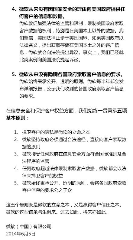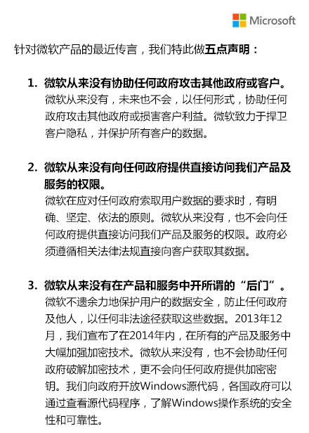 微软中国 官方微博正式对最近关于microsoft传言作出了“五个从来没有的声明”:1.微软从来没有协助任何政府攻击其他政府或客户;2.微软从来没有向任何政府提供直接访问我们产品及服务的权限;3.微软从来没有在产品和服务中开所谓的“后门”;4.微软从来没有因国家安全的理由向美国政府提供任何客户的信息和数据;5.微软从来没有隐瞒各国政府索取客户信息的要求。