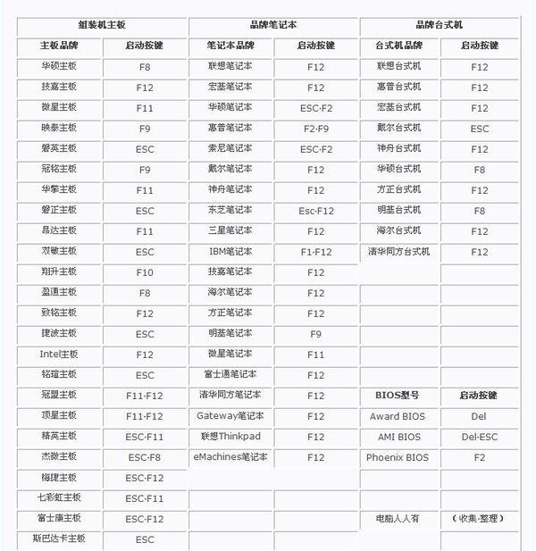 (2)u盘启动可以让我们在不使用其他磁盘介质的情况下,让U盘进行临时启动。不同品牌的电脑主板BIOS启动的快捷方法也不同,几种不同品牌常用启动热键如图2所示:
