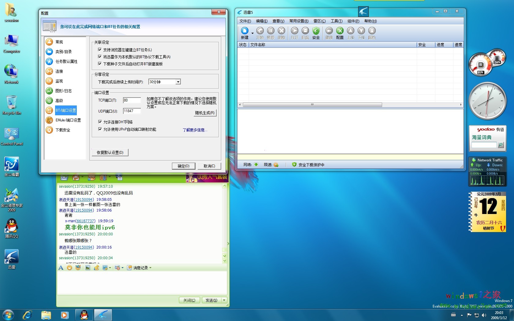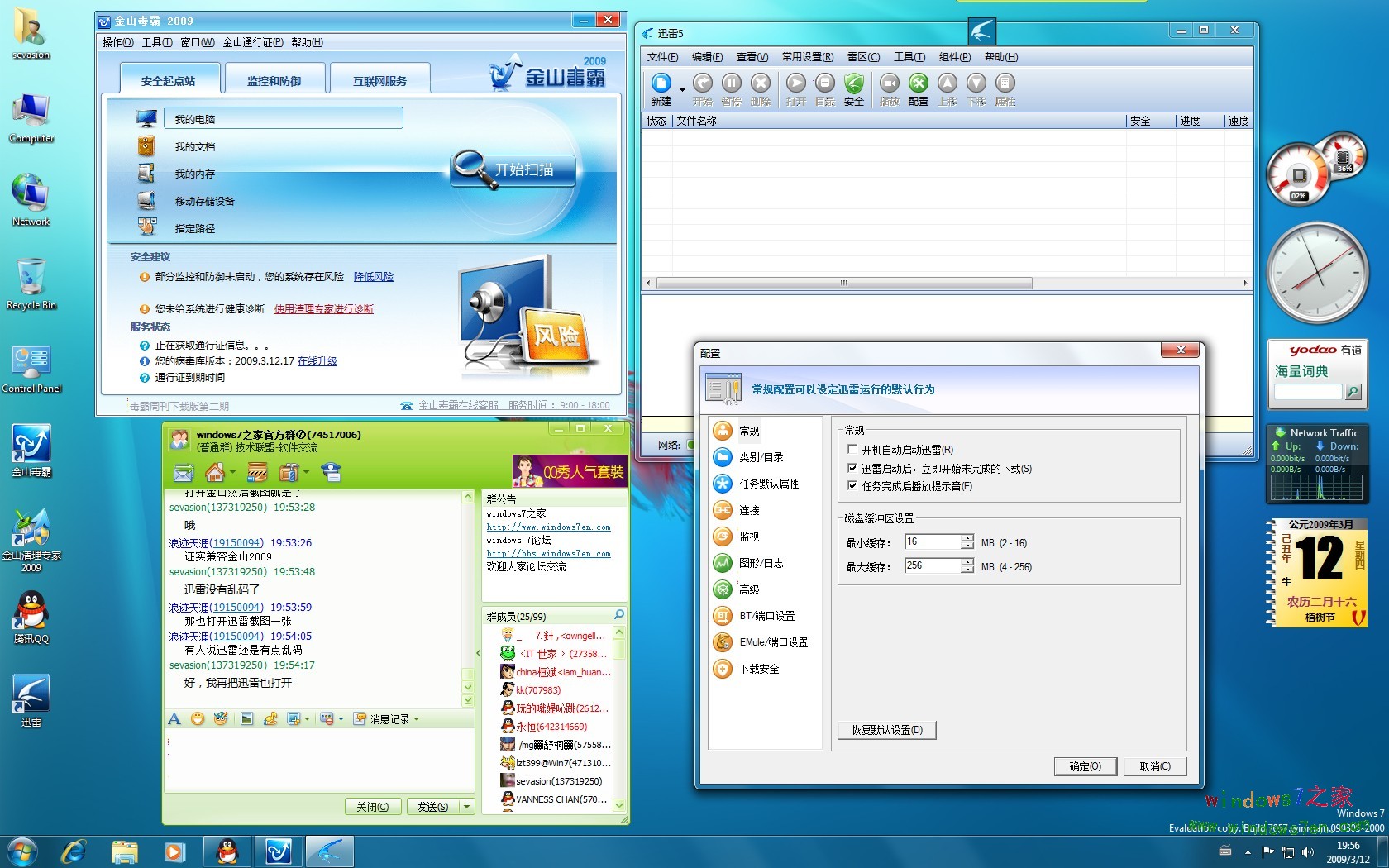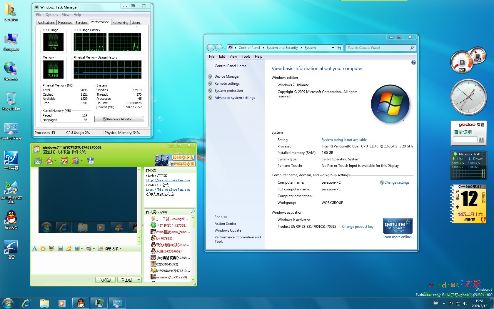 内存及CPU使用情况,及边栏截图,内存使用了715M,确实是大点了!金山毒霸2009,QQ2009工作正常,无乱码