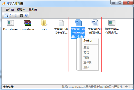 注:如果你觉得配置复杂,也可以使用一些共享文件夹管理软件、共享文件夹权限设置软件来设置共享文件夹的访问,例如有一款“大势至共享文件夹管理软件”就可以轻松设置共享文件夹各种访问权限,可以只让读取而禁止复制共享文件的内容(例如word)、禁止另存为本地共享文件或打印共享文件,同时被加密的共享文件只能在特定共享文件列表框内查看,从而也可以阻止通过U盘、网盘、FTP、QQ发文件的方式将共享文件发送出去,从而彻底保护了共享文件的安全。如下图所示: