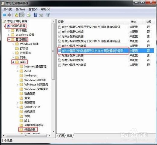 (2)点击“计算机配置”—“管理模板”—“系统”—“凭据分配”,双击右边窗口的“允许分配保存的凭据用于仅NTLM 服务器身份验证”。