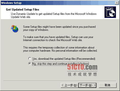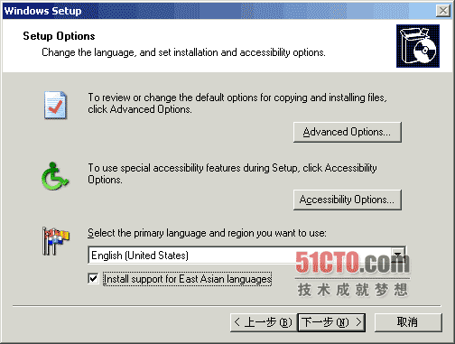 第一步:保持中文版XP在正常运行状态,将第一张Windows Server 2003 R2的光盘放入光盘驱动器中,运行盘中的安装文件setup.exe,出现如下一些画面: