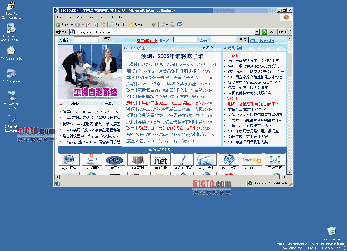 昨天一个朋友送给我一套电脑系统盘,说是微软新发布的一款服务器操作系统,叫Windows Server 2003 R2 。一共有2张光盘,第一张560多兆,第二张100多兆。我在网上看了一下,果然是微软新出的一款操作系统,据说还是微软很自豪的一款服务器产品呢。因为我只是一个普通个人用户。所以,如果装上了我的电脑,也只能使用其中的一小部分功能。但是为了满足我自己的好奇心,我决定安装一下这个系统。你现在看到的文章,就是我在新装完的Windows Server 2003 R2系统上写的,利用的是英文版IE6.0和英文系统自带简体汉字输入法(用左alt键和左shift可以调出)。虽然系统是英文版的。但是中文字符的显示和输入看起来还不错。