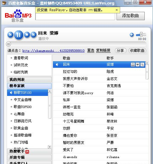 有些东西不是新就比老的好,百度音乐播放器就是如此,新版的百度音乐播放器并没有老板的实用,老版可以在同一页面添加歌曲播放,还能点击分享按钮获取该歌曲的外部调用FLASH代码,新版的虽然界面好看了,就没有这个老版的那些功能了;我喜欢听音乐,为了节约系统资源,我都不开酷狗听音乐,一般都在网页上听,为了自己方便就做了这么一个百度老版音乐盒,方便自己听歌并分享歌曲,喜欢的朋友就用用吧,金山毒霸、小红伞扫描无毒,360可能会误报。