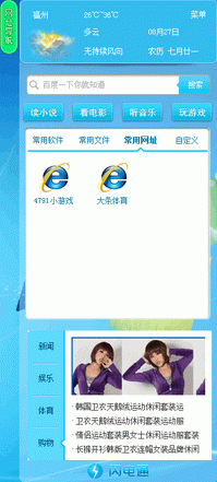闪电启动集合了 便捷网址导航、音乐在线试听、影视在线播放、在线小说阅读、新闻资讯、在线游戏中心、即时天气预报、打折机票酒店等一键式便捷网络生活服务。