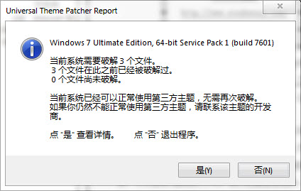 2、请根据你的系统运行对应的程序,32位系统请运行UniversalThemePatcher-x86.exe;64位系统必须运行UniversalThemePatcher-x64.exe。在64位的Windows下,建议你同时破解32位与64位两份系统文件以保证破解完全。