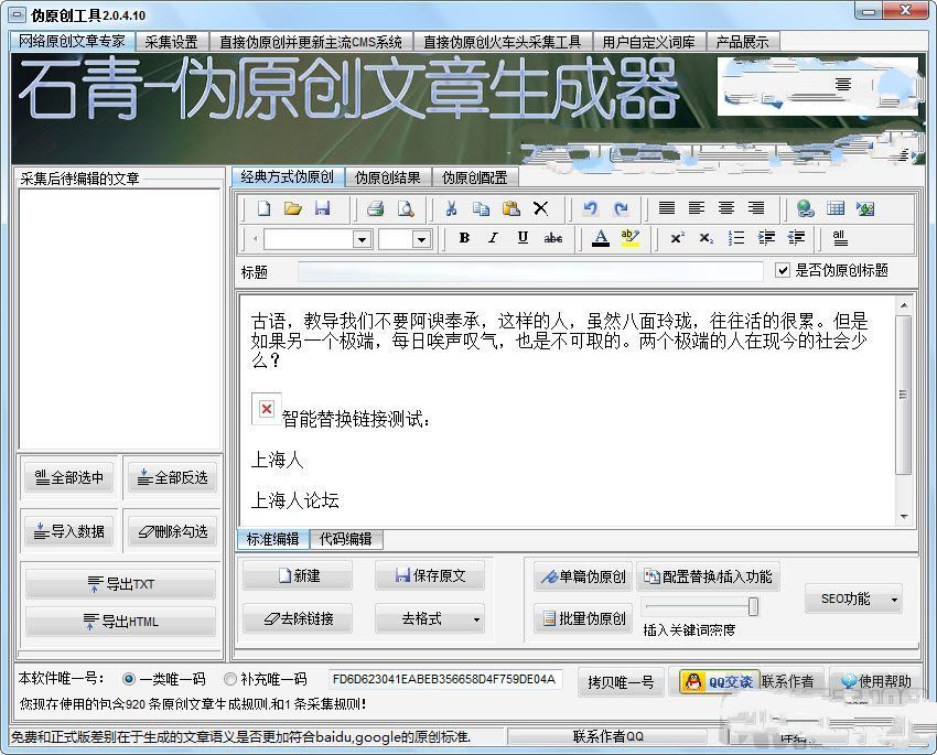 伪原创工具是一款SEO高级工具,专门用来生成原创及伪原创文章,使用伪原创工具可以制作出互联网上具有唯一性的伪原创文章,支持中文和英文伪原创。本软件是一款免费的专业伪原创文章生成器,其专门针对百度和google的爬虫习惯以及分词算法而开发,通过本软件优化的文章,将更被搜索引擎所青睐。石青伪原创工具是网络写手,群发用户,SEO者不可多得的利器,也是网站推广者必备工具。
