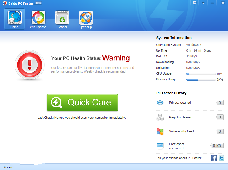 百度电脑安全优化工具baidu pc faster是百度推出的一款系统加速软件,baidupcfaster简称baidupcf。pcf是personal computer faster的首字母组合,目前仅提供英文版,具备系统优化、系统漏洞修复、垃圾清理、注册表清理、启动项管理等诸多常用系统维护功能。该软件界面简洁,操作简单。