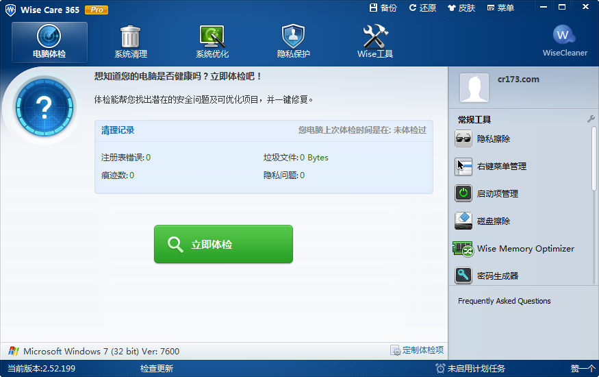 365智能优化(Wise Care 365)是由wisecleaner开发的一款用来管理,维护,配置以及解决电脑故障的适用于windows操作系统的电脑的免费软件。其实wise care 365就是把这个公司之前推出的所有优化工具整合在一起,并增加一些高级功能,所以wise care 365的优化功能是非常全面的。它能够清理无效的注册表,无用的文件,对注册表碎片及磁盘碎片进行有效的整理优化等。此外,该款免费软体还提供了一些其他的使用工具,如wise data recovery, wise folder hider等等。通过一系列完善的清理优化操作,可以有效地提神硬盘速度,从而提高整机性能。wise care 365具有漂亮的界面,支持简体中文,普通用户可以免费使用,需要高级功能可以升级为专业版。