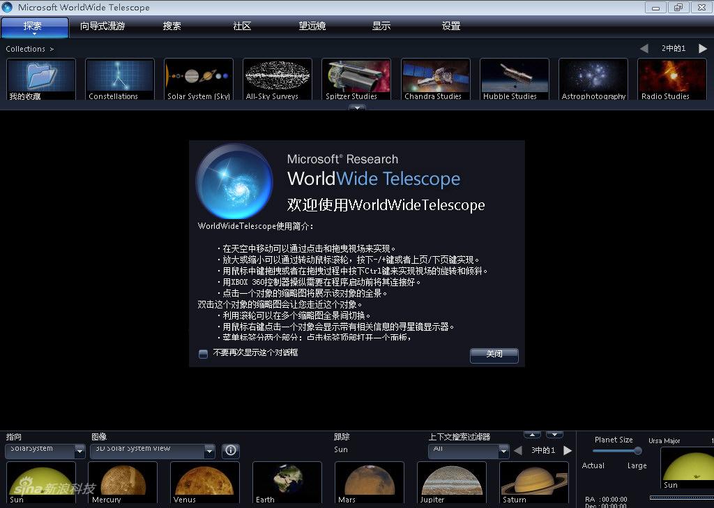 WorldWideTelescope是微软桌面太空望远镜软件。用户可以观看夜空,也可以将任何地域的数据放大。微软表示要加入哈勃望远镜和多个环绕地球的望远镜,为用户提供更为准确的数据服务