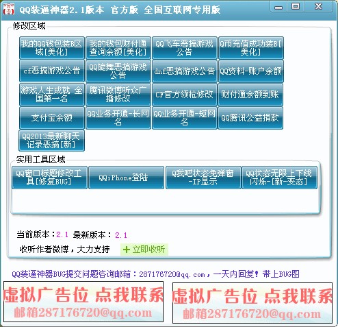 QQ装逼神器2.1软件更新了很多QQ最新业务功能。【新】QQ状态无限上下线闪烁【实用】【新】QQ2013最新聊天记录恶搞【修改】QQ公益捐款金额【修改】QQ窗口标题修改工具【修改】QQ业