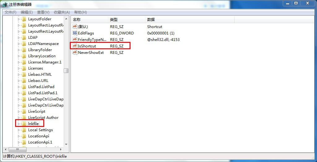 1. 依次点击开始按钮,输入regedit,然后依次找到“HKEY_CLASSES_ROOT---lnkfile”;删除“lnkfile”子项中的“IsShortcut”字符串值项。如图二