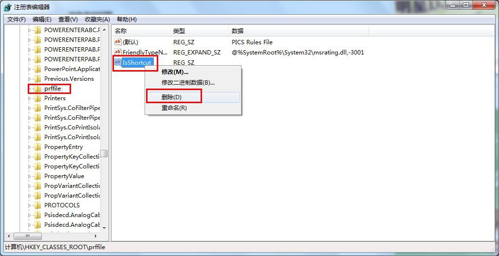 2.接着我们找到“HKEY_CLASSES_ROOT---piffile”,删除“piffile”子项中的“IsShortcut”字符串值项。如图三
