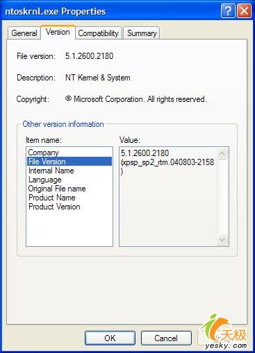 目前,我们所测试这款XP SP3系统版本号为5.1 (Build 2600.xpsp.070718-2058 : Service Pack 3, v.3180),NTOSKRNL.EXE文件版本号为5.1.2600.3180。